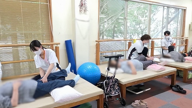 リハビリ | 理学療法士が医師から指示された理学療法プログラムをもとに麻痺したり・筋力の低下した筋肉に段階的に運動を課し、機能改善へと向かわせる運動療法(歩行訓練・動作訓練・筋力増強運動など)と電気刺激などにより筋肉の動きを改善したり、痛みを和らげる物理療法があります。 |
